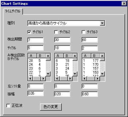 タイムサイクルのチャートを表示状態にし、チャートを右クリック、ポップアップメニューから「チャート設定」を選択すると設定ダイアログが表示されます。