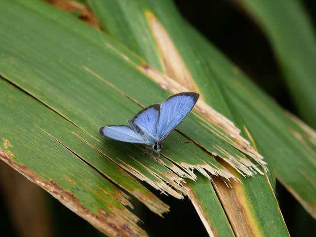 翅表の青がルリシジミより濃く鮮やか。晴天時にはテリトリーを張る。
