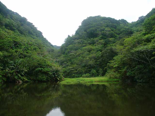 浦内川河口の船着き場付近、川岸にマングローブが広がる。 |