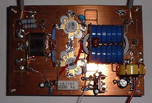 サイズは150×200mmの基板で製作しています。バイアス回路におまじないの RFCチョークを入れました。回路が発振しやすいためです。出力側のコイルには、 今回初めて銅パイプを使ってみました。この方が安定するのですが、効率は高いと はいえません。やはり、同軸の編線の方が特性もよく高周波には向く様です。 ただ発熱はかなり収まりました。コアは5B4を斉藤電気で手に入れました。 できれば、ローパスフィルターもこの回路の中に入れたいのですが200X200mm位 のサイズがないと収まりがつきません。最低-40dbは断念しました。 |