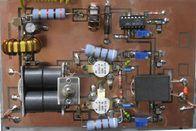 実際にパワー電解効果トランジスターを組み込んだ物です。入力VSWRは入力10W時に1.2以下に追い込んでいます。 重要なのは、右側の入力トランスの設計にあります。銀メッキ のケーブルを用いることは基本ですが、小型のパイプを通した 物でないと綺麗にVSWRが落ちてくれません。 また、FETを別のものに変えた場合は、FETの内部容量が異なるため再度設定をしなおす必要があります。 試しにMRF150を取り付けてマッチングを取りましたが、出力 タンクコイルの設定変更はありませんでしたが、入力コイルで は、入力側にひとつ出力側にひとつコンデンサーを入れなければ うまくマッチングが取れませんでした。 |