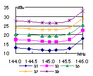 調整後は、以下のような結果になりました。高い周波数で落ち込みがありますが、使用しない領域なので気にしないことにします。メータは2目盛り多く振れるようになりました。(メータは0から10までの均等目盛りで、S表示ではありません)