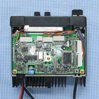 下カバーを開けると、受信回路が見えます。上カバーを開けると、周波数制御回路の基板があり、この下に送信回路基板があります。周波数制御基板にしている穴は、送信基板のボリュームやトリマを調整するためのものです。