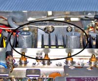 原因はドライブ段のセラミックトリマが2箇所壊れかかっていたからでした。わずかな接触の有無でパワーが数W変化しますので、交換しました。右写真は交換後ですが、丸の位置とシールドケース内にもう1箇所あります。
