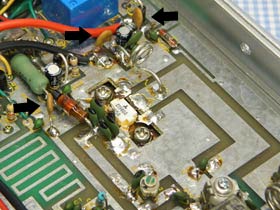 パワー計からは、この現象は判別不能です。電源回路を安定化するため、上写真矢印のパスコン3個を追加しました。以降、安定して動作します。