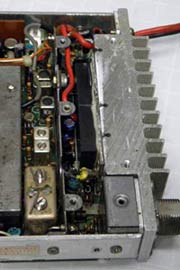 狭いスペースに部品が並び、発熱するパーツ(ファイナルのパワーモジュール、低周波アンプ)の真横に電解コンデンサが配置されています。熱による劣化が進み、寿命が短くなるでしょう。