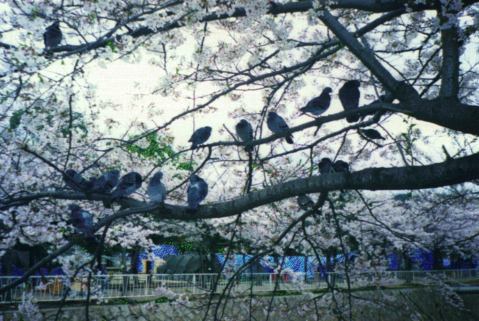 避難用のテントが自衛隊によって設営された。本写真はその時の情景でテントのまわりに桜が咲き鳩が休んでいる。