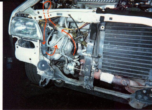 空気の流れは赤線で明記したようにターボで圧縮したエアをスロットルを通過させてから更にスーパーチャージャーで