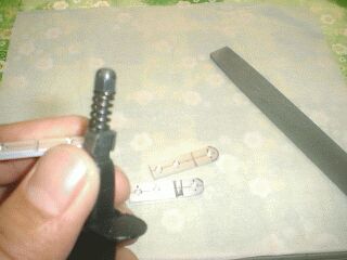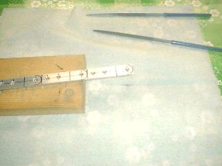 ▽か□型のヤスリで、前の作業で作ったスジ道にヤスリがけして、曲げる部分をV字