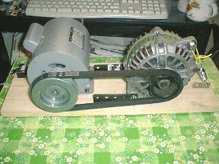 単相モーターを板に取付けて、ベルトでオルタネータを回します。