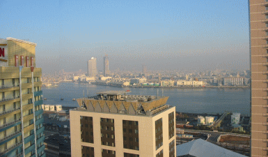 左に京阪ホテル、右に日航ホテルが見える。高層ビルは弁天に建っている。ホテルがなければただの港と倉庫のあるさびれたところだ。