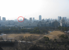 右の写真は大阪城の西を撮ったもの。見づらいが、赤丸で囲ったところは、ホテルから見えた、弁天の3棟のビルだ。点と点がつながって、やたら感動した。