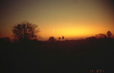 列車は座席指定だが満員。しばらくは車内を物売りが行き来する。 列車は縦揺れも横揺れもすごい。食堂車も付いていた。 夜の11時ごろに停車し、随分露店があるなぁと思っていたら駅で、 皆なが降りて食べに行くので、ついていった。プラットフォームはない。 地面から直接車両。ゆっくり見ているヒマもなく発車の警笛が鳴り、 皆、乗車口に群がる。私も続いたが、両手に食べ物を持って、地面から いきなり車両は登れず、後ろの人にお尻を押してもらっちゃいました。 眠る時間になると、毛布を持ってきている人が結構いる事に気づく。 2人掛けの席に1人が横になり、もう1人は床で寝ていたりする。 (乗務員が来ると、席に戻るのでイケナイ事らしい。) 写真は車窓より。 |