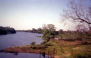 一本道の道路がいきなりなくなり、目の前が水なので驚く。 乾期には道路が走っている所が、雨期には川が横切り、フェリーで渡る。 水の中から木が生えている。 |