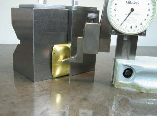 ハンマーで叩きたい(たたき)部分に当て金(あてがね)(この場合は真鍮の端切れを使っています。)を当て、ハンマーで叩きます。ハンマーで直接叩くのでは無く当て金を当てて、傷が付くのを防ぎます。最初は軽く、様子を見ながら力を加減します。 |