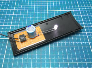 屋根板に固定した所です。LEDは下に向け、光拡散用キャップをはめておきます。なお今回は3mm径で電灯色のLEDが入手出来なかったため、温白色のLEDを使いました。ちょうど白色蛍光灯の色です。本来ワフ29500は「電灯」なのですが。 |