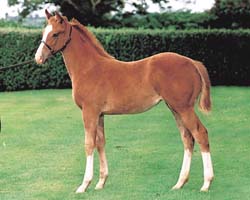 | 12月上旬もアイルランドのRathbarry Studで放牧されている。市川氏の話では、愛国は日本と違い一年中草が豊富で、放牧地もとにかく広大だという。本馬は、そのような環境で昼夜放牧され、変わりなく元気で、順調に成長しているとのこと。以前、見たビデオからは、ガシッと逞しい体型ながら柔軟性に富んでおり、全身を使った俊敏な動きが印象的で、さすがデンヒル系のスピード馬といった感じがした。また、日本への来日時期については、もう少し暖かくなってから馬の体調を見ながら検討する為、現在のところ未定。 |