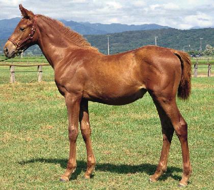 | 6月上旬も五丸農場分場で放牧されている。他馬の方が成長が早くキ甲抜けが良い分、本馬は体高は小さい方だが、父の産駒らしく成長するにつれ胴伸びの良さが目立ち、決して小さな馬ではない。産駒は実が入るのが遅い傾向があるので今時期細いのは仕方ないが、本馬は体型的にはそれなりにバランスが取れているし、それほど遅いとも限らない。段々と身体の線が整ってきたし、これからどんどん変わってくるだろう。動きもますますゆったりした感じになり、父の影響が強く距離適性は長めだと思うが、身のこなしが実に大きいし軽快な面もあるので、配合どおりの良さを感じる。 |