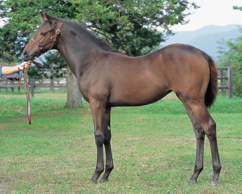 | 7月上旬も大北牧場第一分場で放牧されている。「牝馬5頭の中では、大きい2頭を除いて、ちょうど真ん中くらいの大きさだね。最近は食いが旺盛で、どんどん幅がでてきたし、順調に成長しているよ」と牧場スタッフ。背丈は普通くらいの大きさだが、相変わらず立派なトモをしており、踏み込みの力強さ、柔軟性が目立っている。やはり良血馬らしくバランスが良く、フックラとして丸みを帯びており、垢抜けて見える。放牧地を走るのびのびとした姿の中にも、バネの強さが感じられ、さすが母系の影響か、随所にスピード能力の高さが窺える。 |