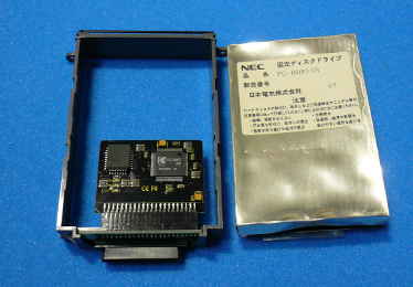 このアダプタでは SDカードは裏面に実装します。これを 98NOTEの HDDパックに取り付けると次の画像の様になります。実際に取り付けるときは 1ピンの向きにご注意ください。