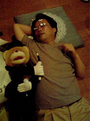 ↓ベースのKは飲み過ぎて爆睡。みんなでいたずらしてみました。ついでにエスパー熊五郎も。