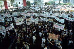 市内では労働者のデモ。低所得とインフレが治安の悪化をも生む持病がある。