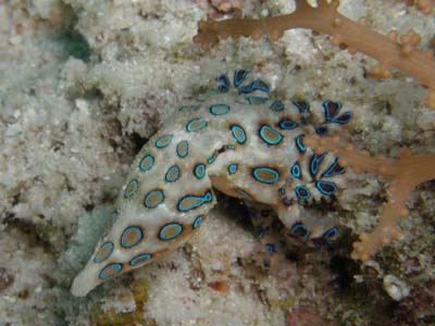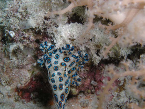 Blue Ring Octopus 日本のヒョウモン蛸とは模様が違う。 噛み付いて猛毒(ふぐ毒)を注入する。 興奮していると鮮やかにきらきらと青いが、落ち着くと見る々色が褪せてゆく。