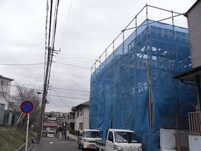 | 2009. 4. 1 3月中旬に上棟を済まし木工事中です。 完成予定は5月以降です。以下は上棟後の写真です。 |