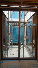 | ↑西棟の中庭の様子です。 (ルーバー部分は工事中) →各棟の出入り口、開口をずらすことで、 お互いに視界を確保できています。(左) 東棟の中庭部分です。お風呂に面した バルコニーが左側に見えます。(右) |