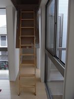 収納の内部写真です。(左) 屋根裏の収納への階段です。 普段は天井に隠れています。(右) |